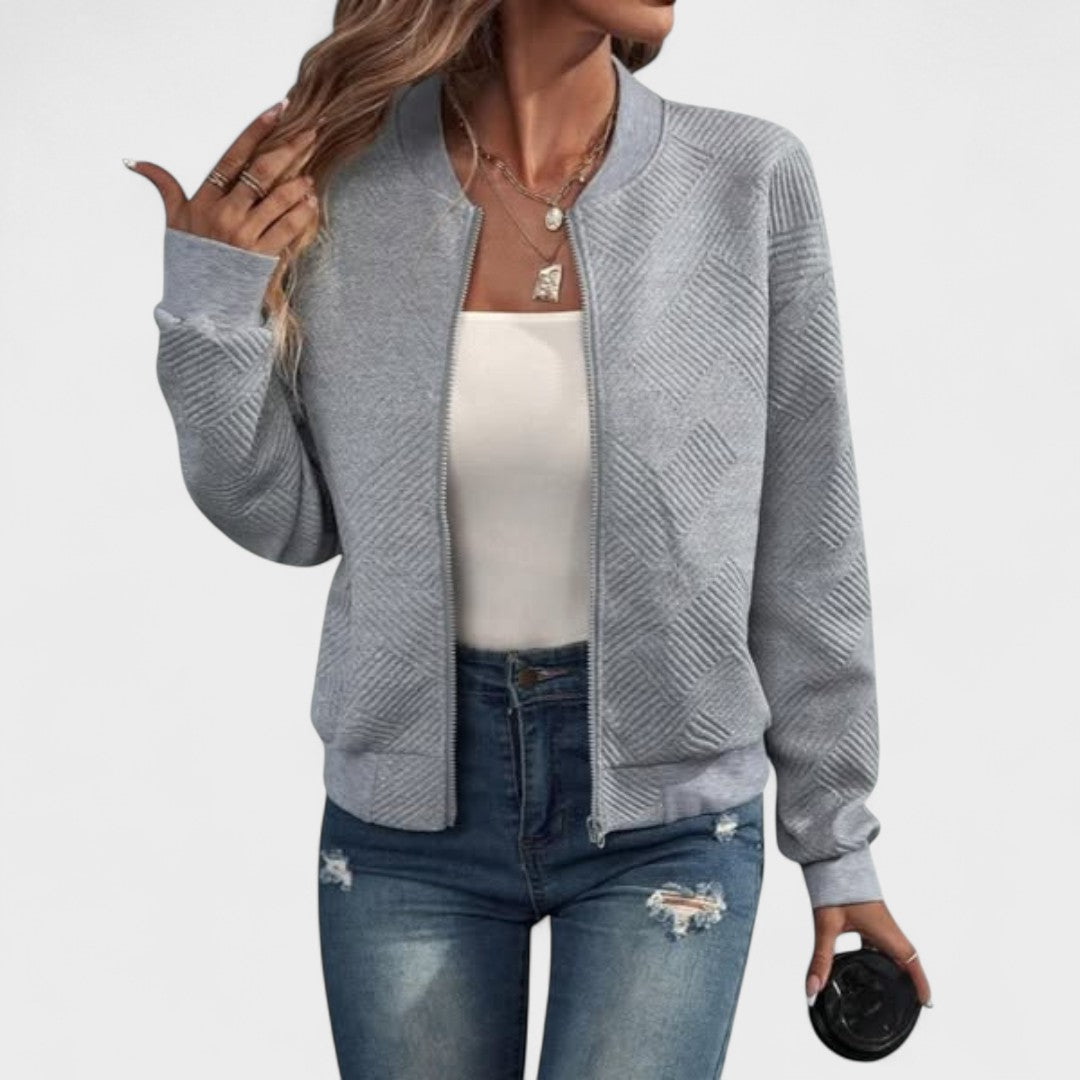 Bunda bomber Dora dodává moderní nádech nadčasovému klasiku. S jemným geometrickým vzorem, praktickým zipem a žebrovanými manžetami pro dokonalé padnutí, je lehká a ideální k jakémukoli outfitu – od džínů po šaty – v jakémkoli ročním období.