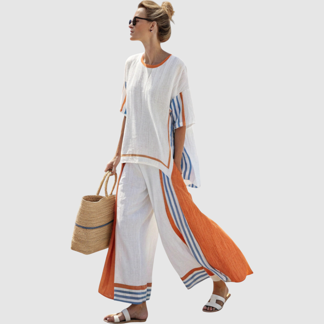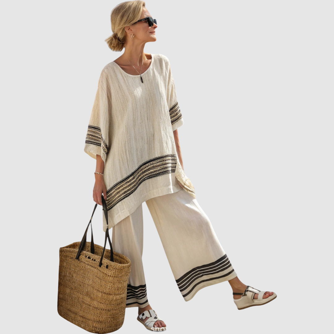 Tato souprava je ideální volbou pro ženy, které chtějí spojit pohodlí a lehkost s moderním stylem. Díky vzdušnému materiálu a volnému střihu poskytuje maximální komfort během teplých dní, zatímco originální pruhované detaily dodávají jedinečný vzhled.